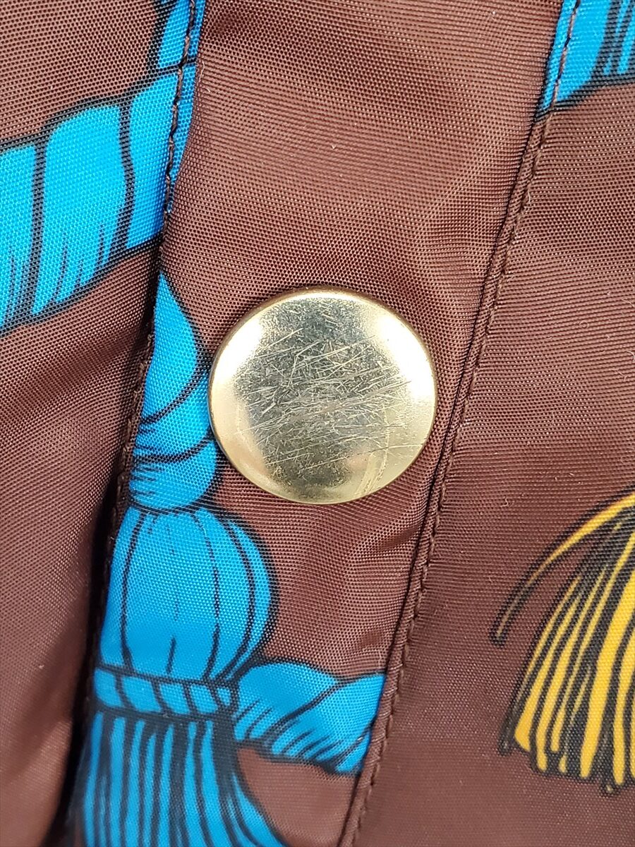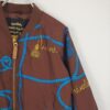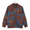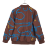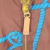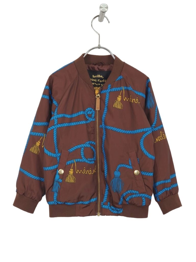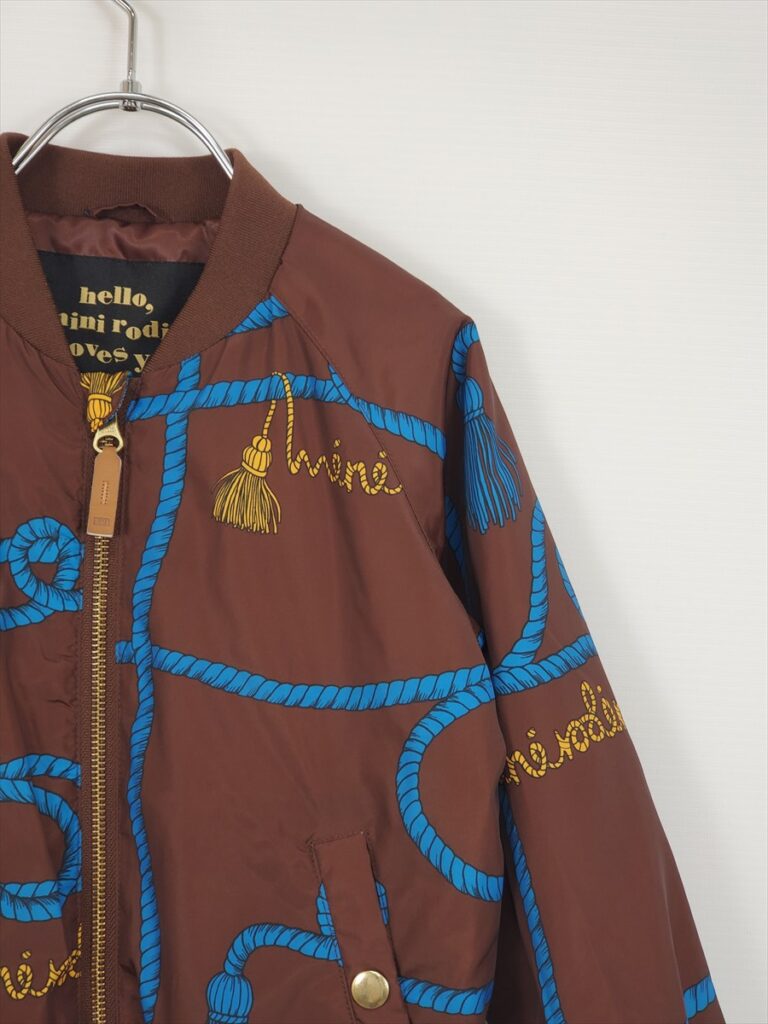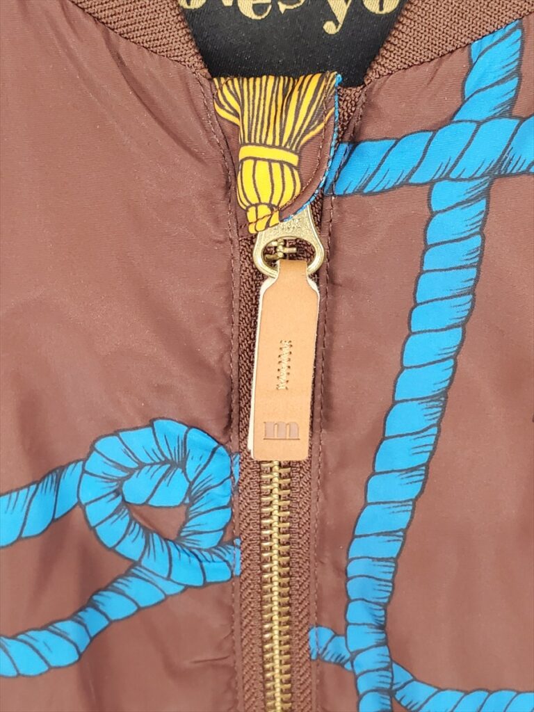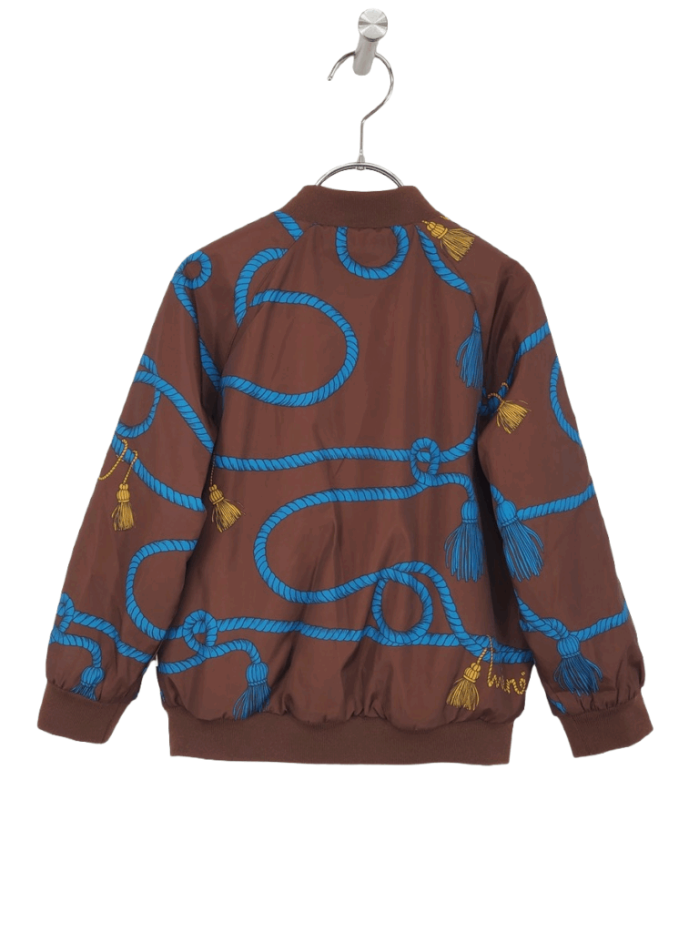 特徴 ブラウンベースにブルーのロープ柄&イエローのタッセル刺繍風デザイン、ゴールド調のフロントジップ&ボタン、リブ仕様(襟・袖・裾)