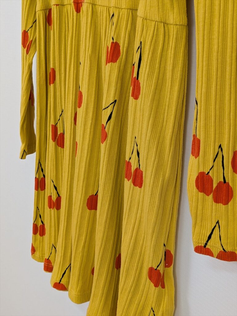 特徴 チェリープリント、リブ調の伸縮性ある生地、Aラインシルエットで動きやすい、北欧ブランドらしいポップで可愛いデザイン