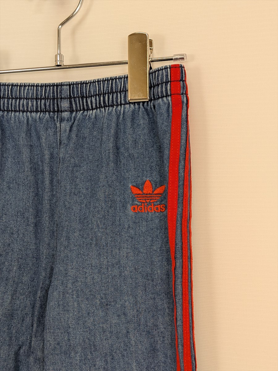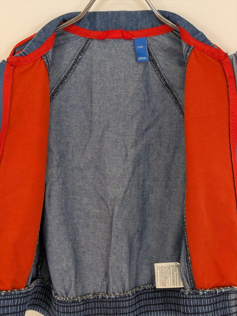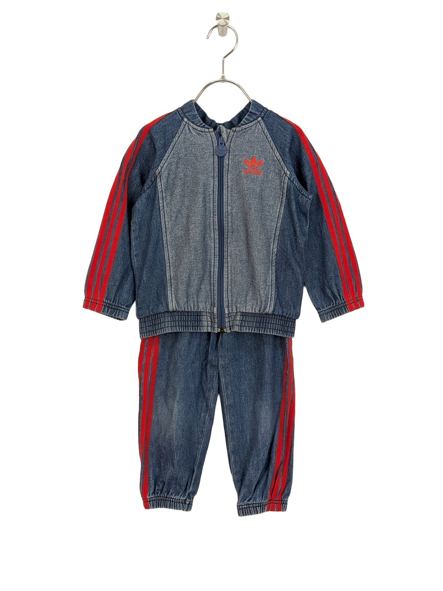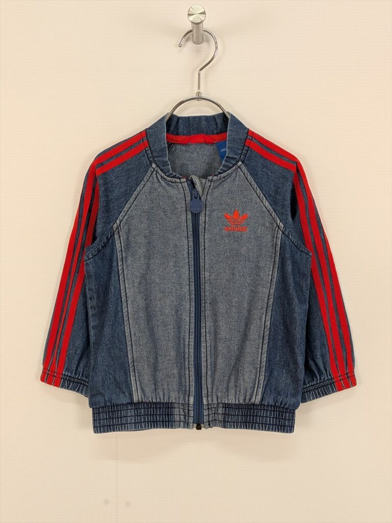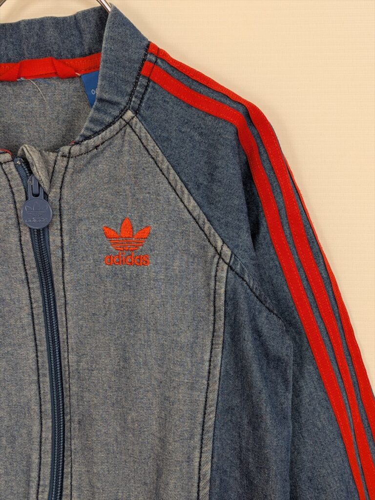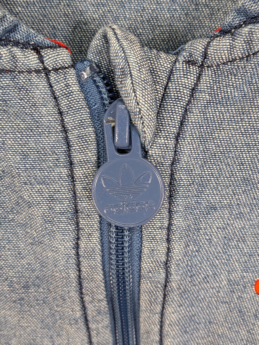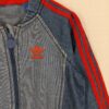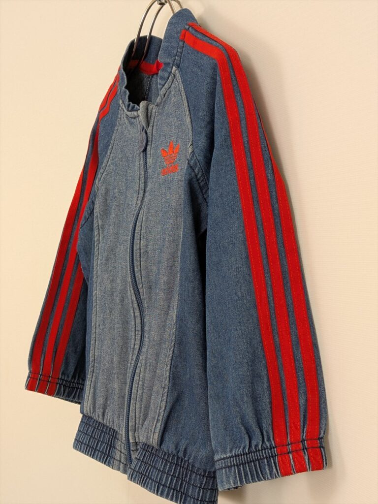 特徴 ジャージ素材ではなく「デニム調コットン」で作られた珍しいセットアップ、ジャケット胸元&パンツにトレフォイルロゴ刺繍(赤)、セットアップ仕様