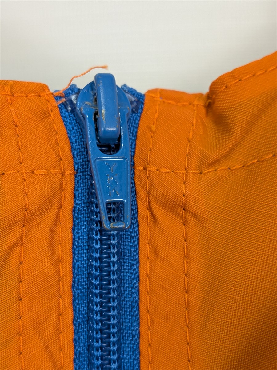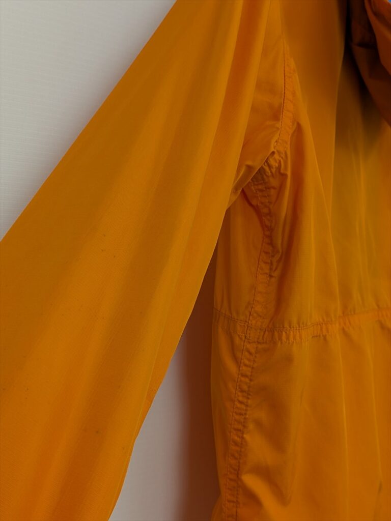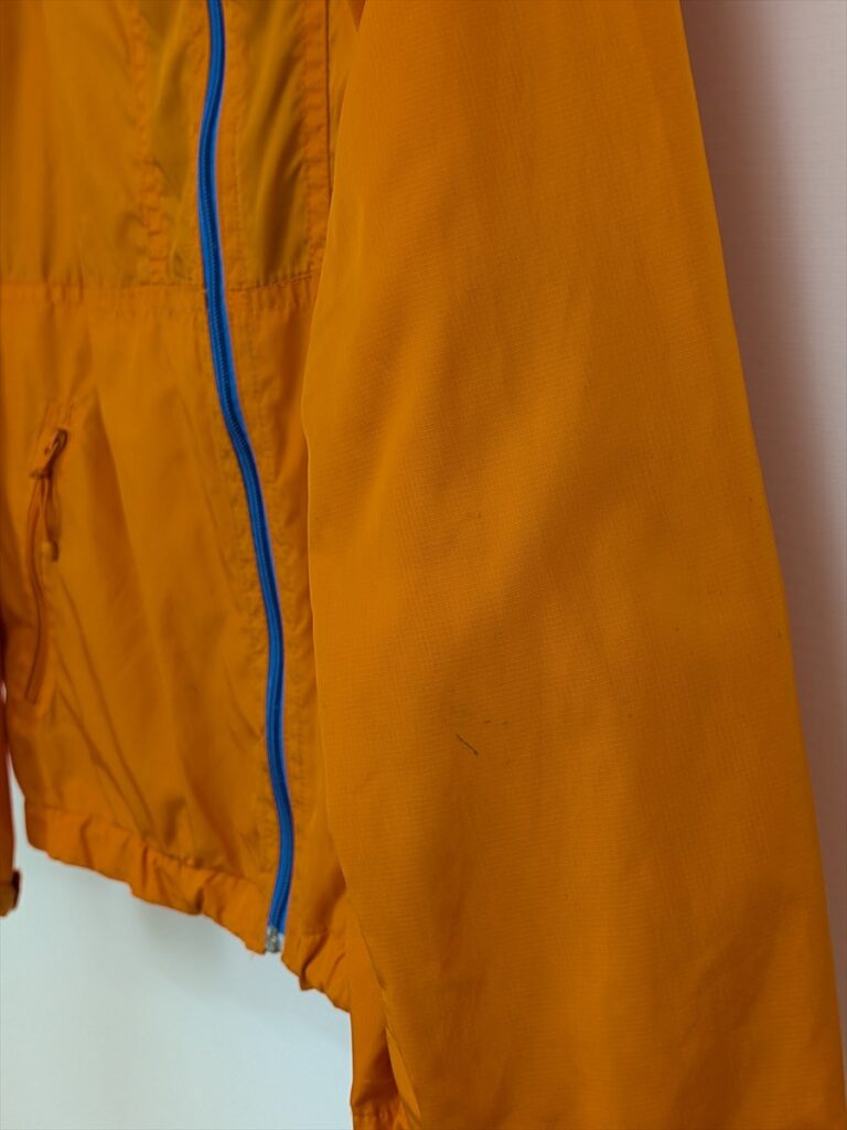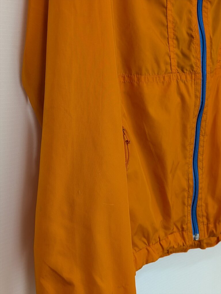 特徴 鮮やかなオレンジを基調に、ブルーのジップ・裏地・ロゴ刺繍を配色、軽量ナイロン素材で、春〜秋のアウターに適したウィンドブレーカータイプ、フード付き(取り外し不可