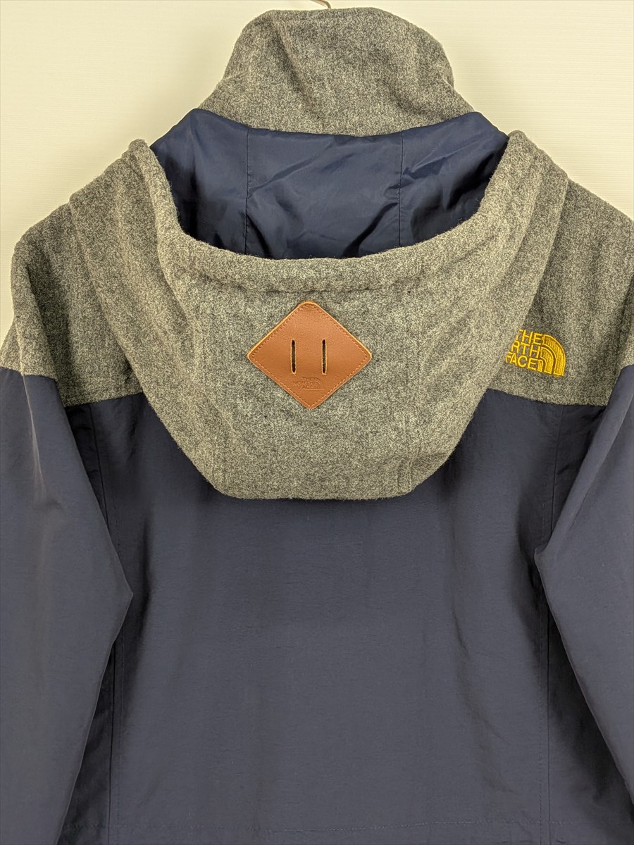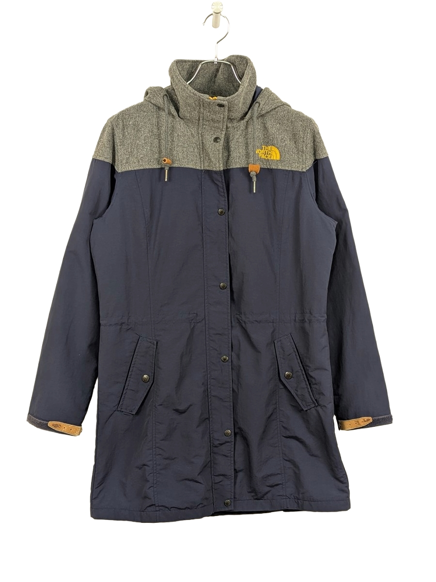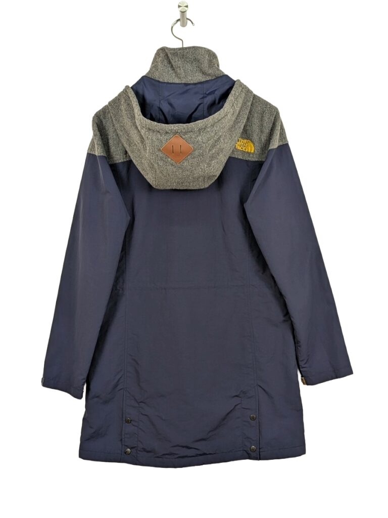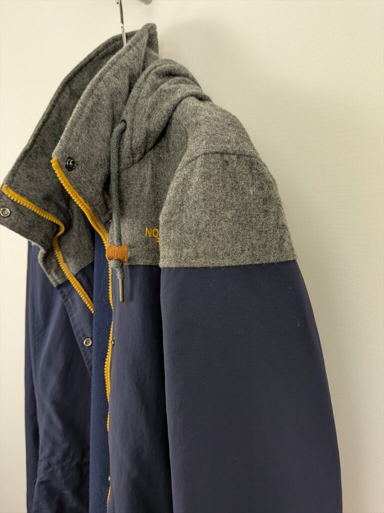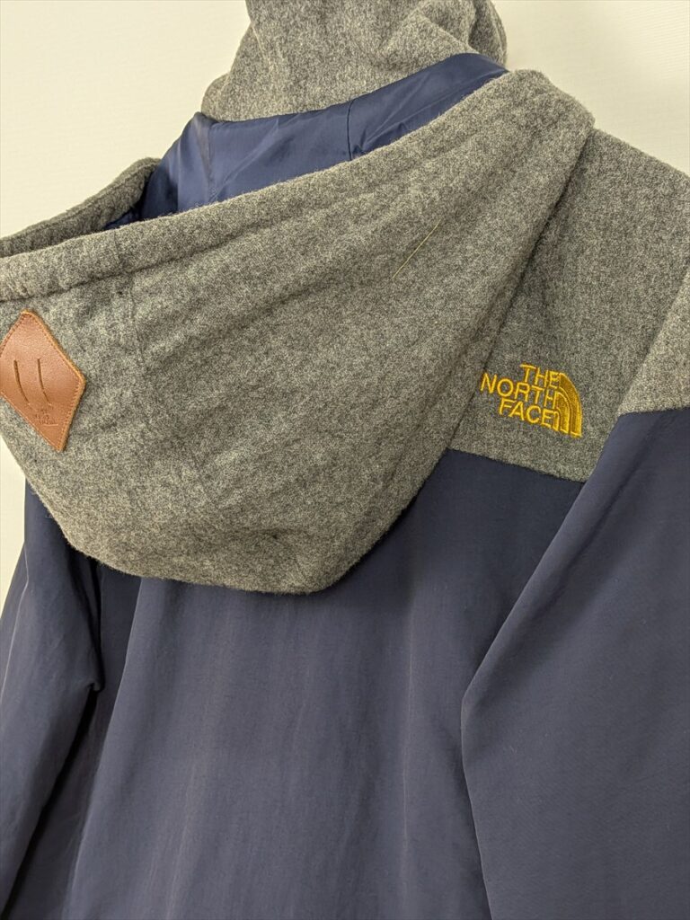 特徴 ネイビー × グレーの切り替えデザイン、フード付き、胸と背面にノースフェイスロゴ刺繍、ミドル丈、スナップボタン+ファスナーの二重フロント