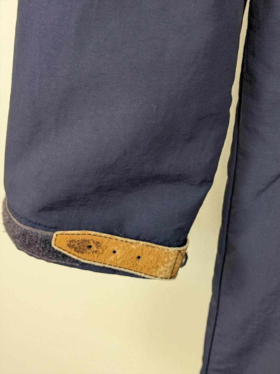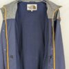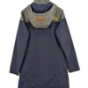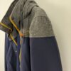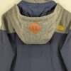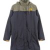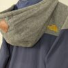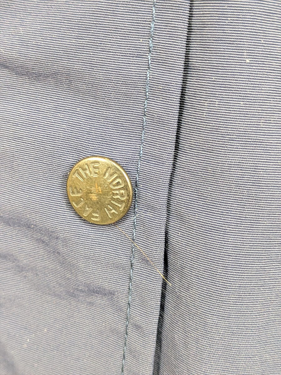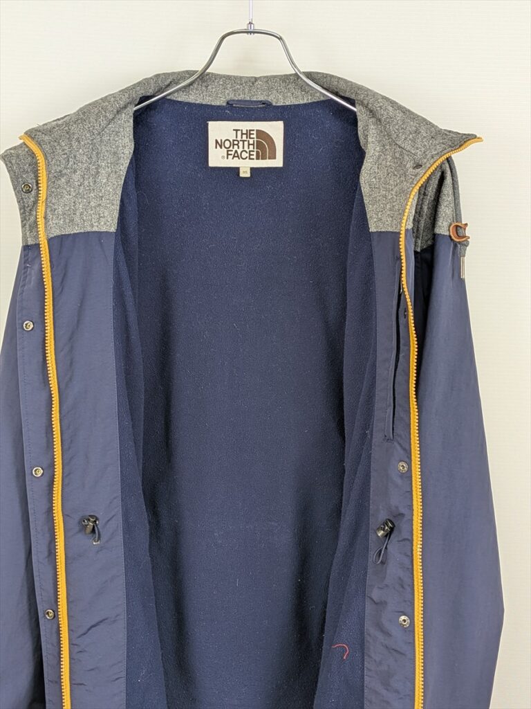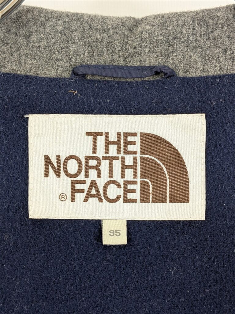 特徴 ネイビー × グレーの切り替えデザイン、フード付き、胸と背面にノースフェイスロゴ刺繍、ミドル丈、スナップボタン+ファスナーの二重フロント