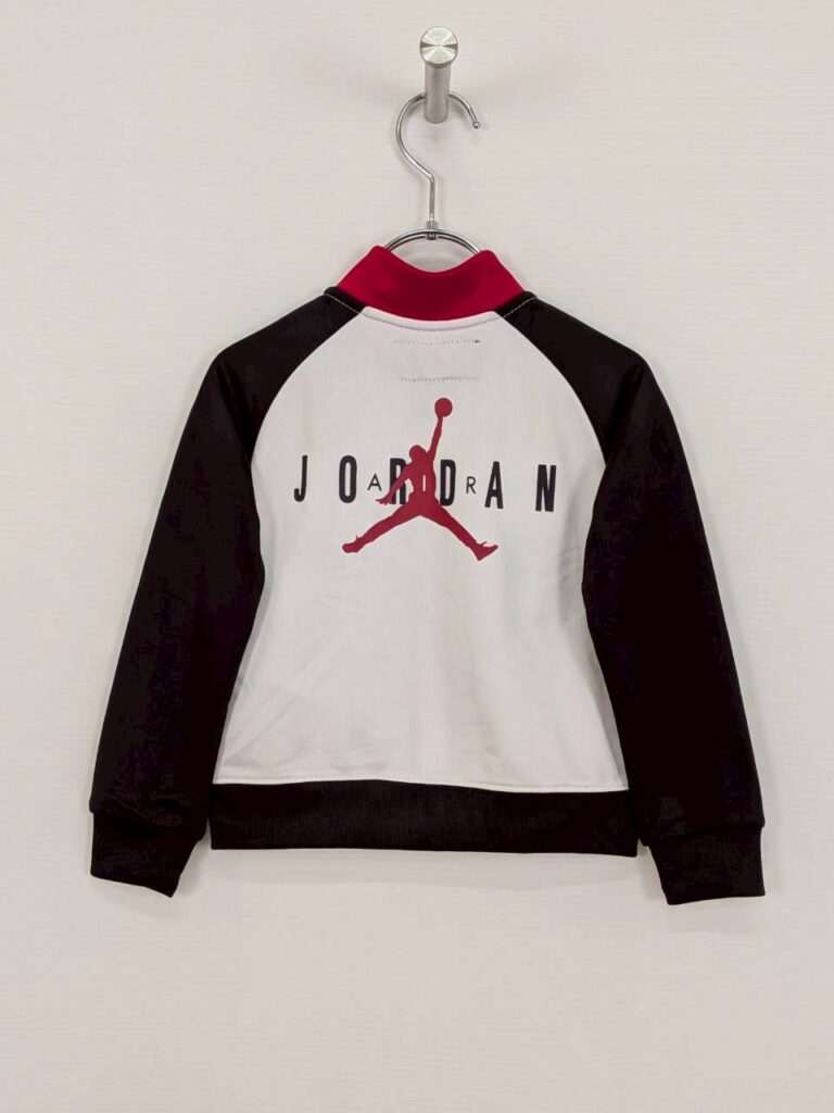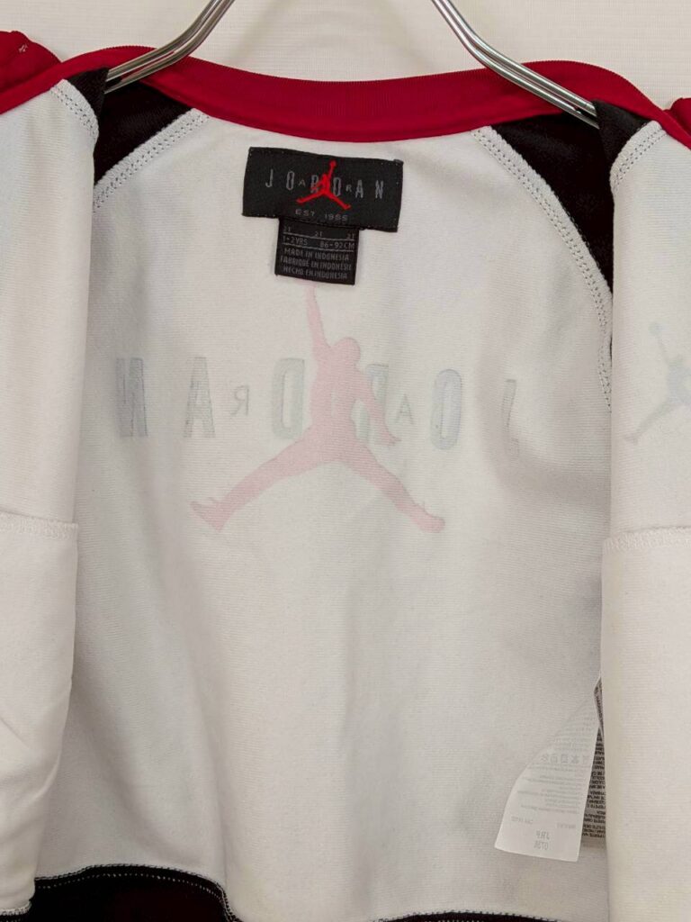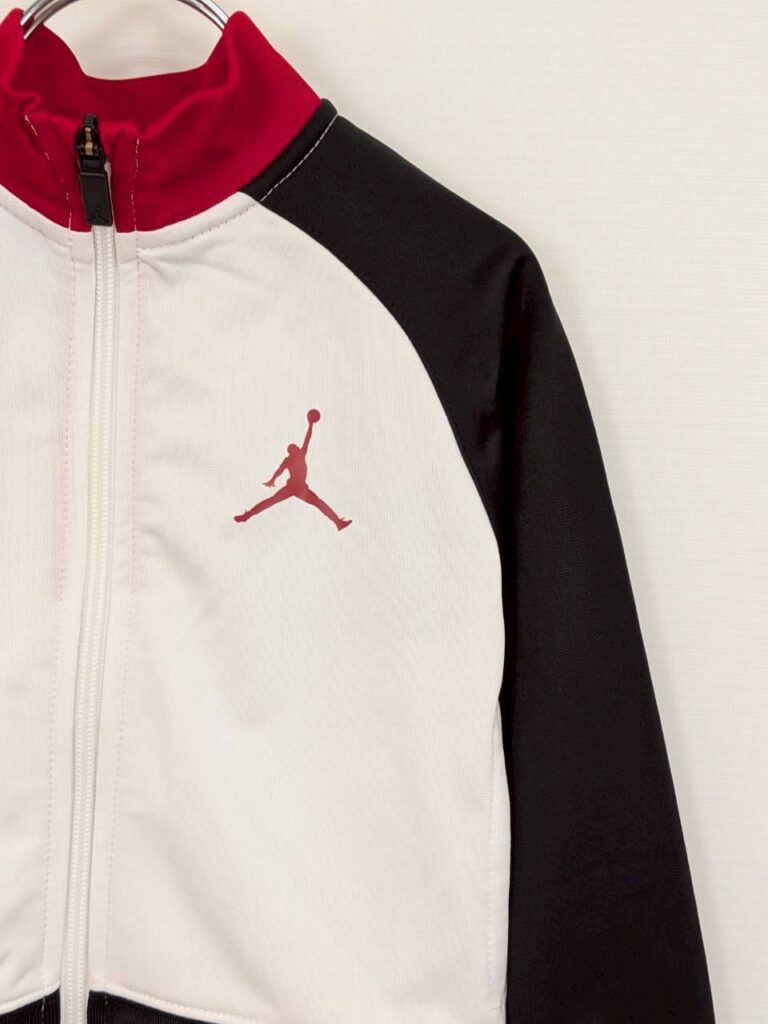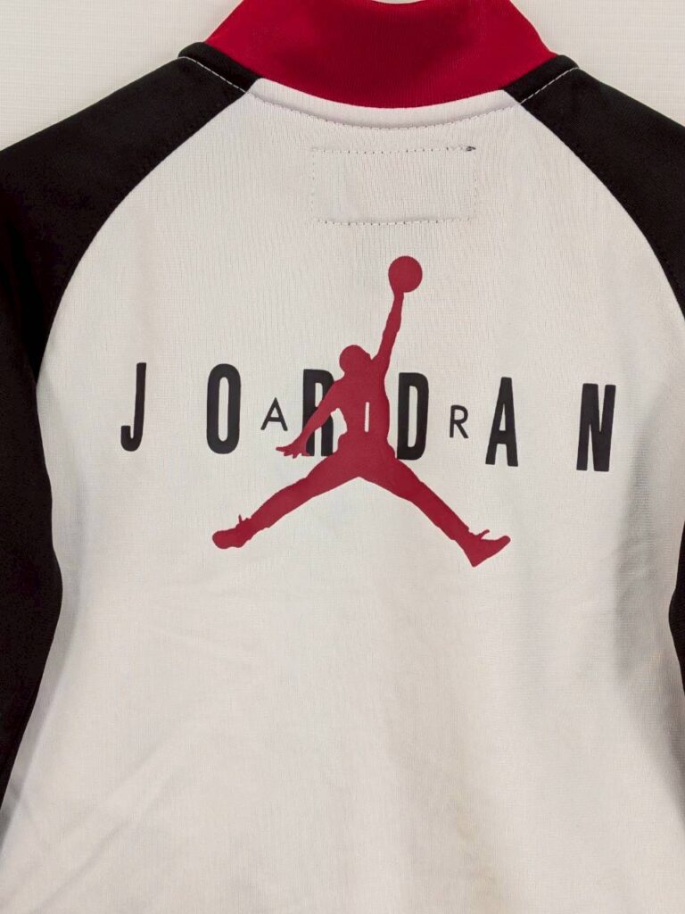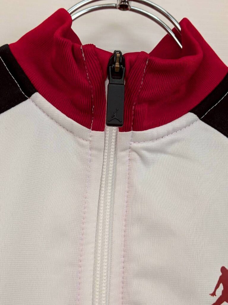 特徴 上下セットアップ(ジャケット+パンツ)、ジャケット: ホワイト×ブラック、レッド襟、胸元にジャンプマンロゴ、背面に大きな「JORDAN」ロゴプリント、パンツ: ブラックベース、両サイドにホワイトライン、ウエストバンドがレッド、左太ももにJORDANロゴ入り、ジッパープルにもジャンプマン刻印あり