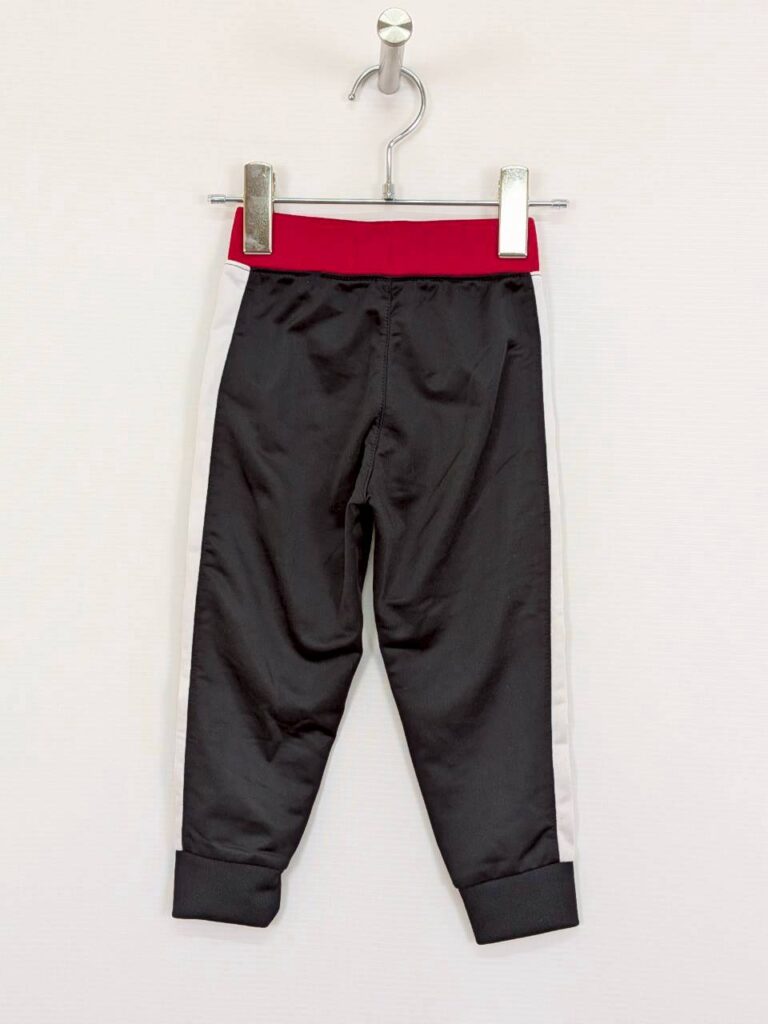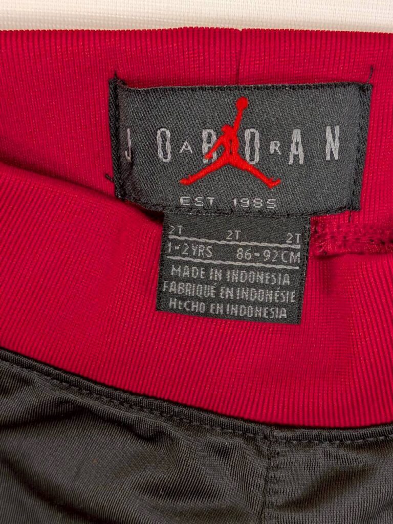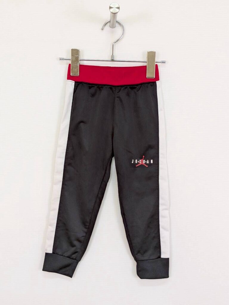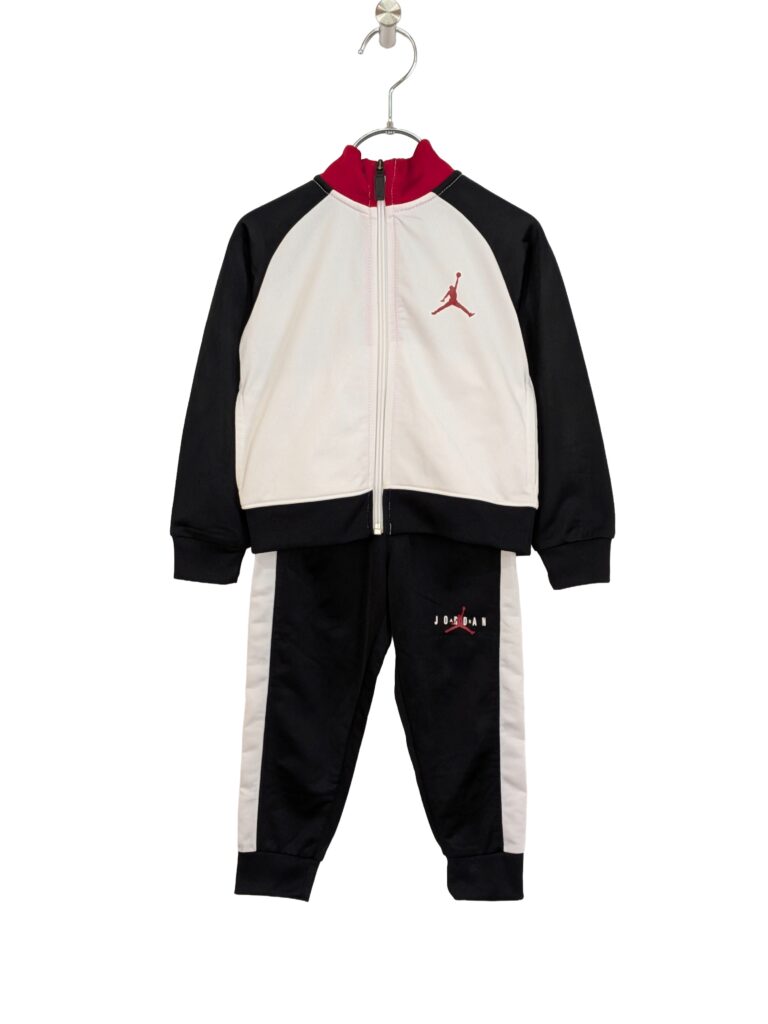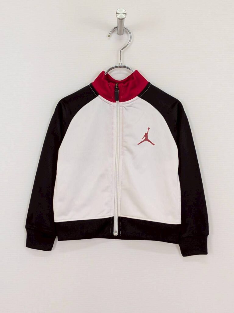 特徴 上下セットアップ(ジャケット+パンツ)、ジャケット: ホワイト×ブラック、レッド襟、胸元にジャンプマンロゴ、背面に大きな「JORDAN」ロゴプリント、パンツ: ブラックベース、両サイドにホワイトライン、ウエストバンドがレッド、左太ももにJORDANロゴ入り、ジッパープルにもジャンプマン刻印あり